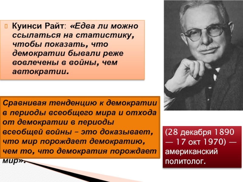 Слайд 74Куинси Райт: «Едва ли можно ссылаться на статистику, чтобы показать,