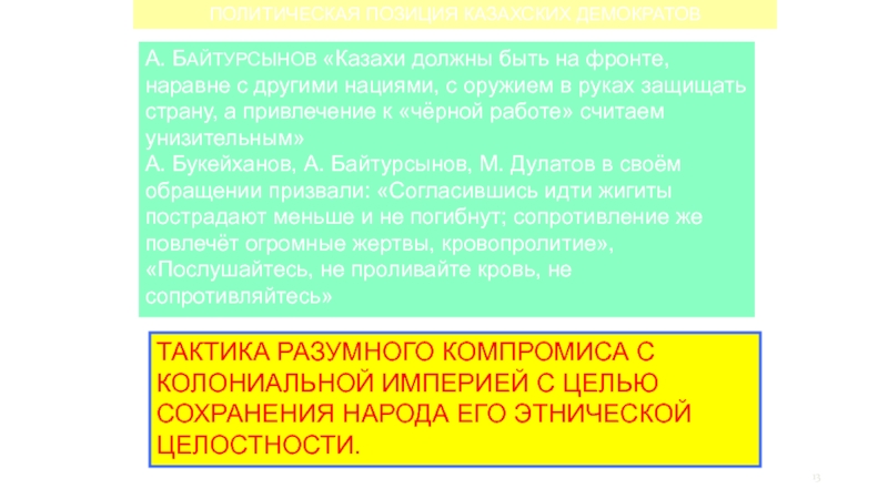 Слайд 13ПОЛИТИЧЕСКАЯ ПОЗИЦИЯ КАЗАХСКИХ ДЕМОКРАТОВ