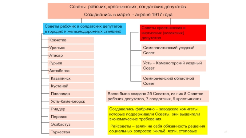 Всего было создано 25 Советов, из них 8 Советов рабочих депутатов, 7 солдатских, 9 крестьянских