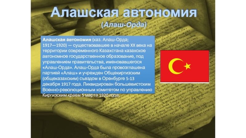 об образовании казахской автономии «Алаш», правительство автономии получило название Алаш – Орда. Территория: Букеевская Орда, Уральская, Тургайская, Акмолинская, Семипалатинская области, районы Закаспийской области и районы Алтайского края населённые казахами. Центром Алашской автономии был объявлен г. Семипалатинск, руководителем А. Букейханов