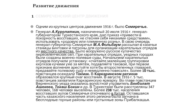Туркестанского края, дал приказ «привести в покорность восставших, не стесняя себя никакими средствами», использовать «родовую или племенную рознь». В свою очередь генерал-губернатор Семиречья М.А.Фольбаум рассылал в казачьи станицы винтовки и патроны для организации карательных отрядов из местного качества. Было вооружено русское кулачество переселенческих сел. При карательных отрядах, уездных городах были созданы военно-полевые суды. Начальники карательных отрядов получили установку: «считайте малейшие группировки киргизов кучами уже за мятеж, подавляйте таковой, при первом признаке волнения арестуйте хотя бы второстепенных главарей, предавайте полевому суду и немедленно повесьте». Более 10 тыс. повстанцев осаждали Токмак. В Каркаринском регионе образовался крупный очаг восстания. В августе 1916 г. 5 тыс. повстанцев захватили Каркаринскую ярмарку. Во главе повстанцев Верненского уезда оказались волостной управитель Бекболат Ашекеев, Токаш Бокин и др. В Туркестане были расстреляны 347 человек, 168 человек выселены. Более 238 тыс. населения восставших аулов Семиречья откочевало в Китай. Оставшаяся часть казахского населения этого региона была загнана в бесплодные горные районы или пустынные зоны Прибалхашья.