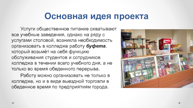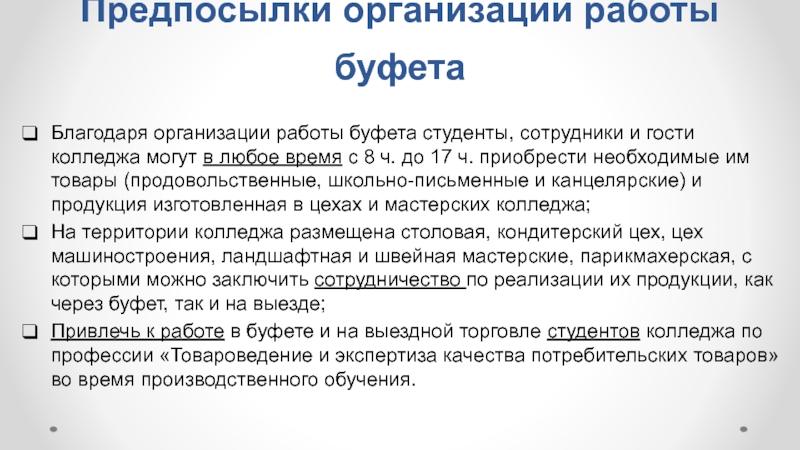 Слайд 6Предпосылки организации работы буфета