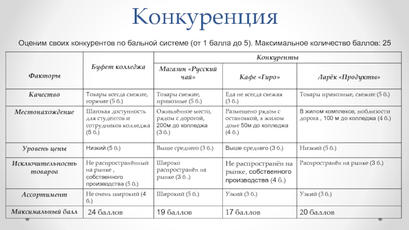 Оценим своих конкурентов по бальной системе (от 1 балла до