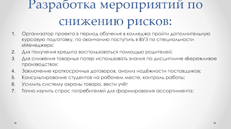 Слайд 18Разработка мероприятий по снижению рисков: