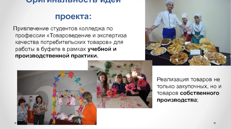 Привлечь к работе в буфете и на выездной торговле студентов колледжа по профессии «Товароведение и экспертиза качества потребительских товаров» во время производственного обучения.