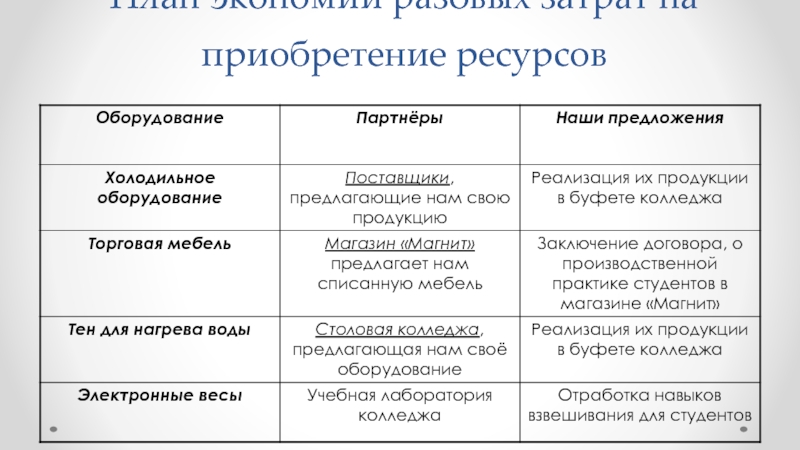 Слайд 12План экономии разовых затрат на приобретение ресурсов