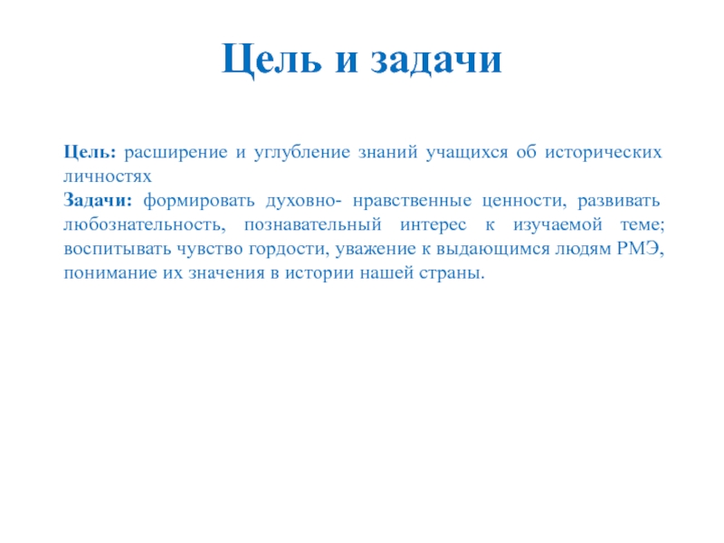 к изучаемой теме; воспитывать чувство гордости, уважение к выдающимся людям РМЭ, понимание их значения в истории нашей страны.