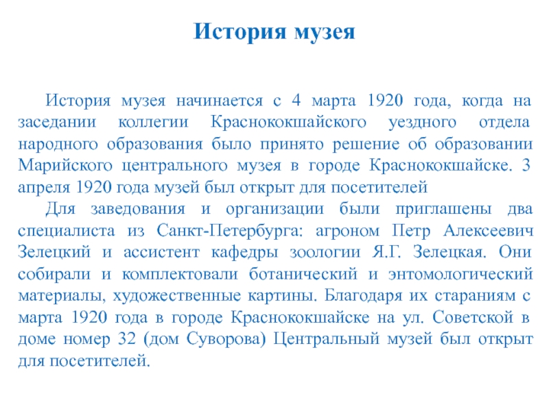 Для заведования и организации были приглашены два специалиста из Санкт-Петербурга: агроном Петр Алексеевич Зелецкий и ассистент кафедры зоологии Я.Г. Зелецкая. Они собирали и комплектовали ботанический и энтомологический материалы, художественные картины. Благодаря их стараниям с марта 1920 года в городе Краснококшайске на ул. Советской в доме номер 32 (дом Суворова) Центральный музей был открыт для посетителей.