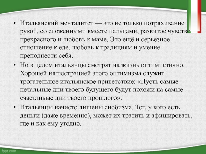 Слайд 15Итальянский менталитет — это не только потряхивание рукой, со сложенными