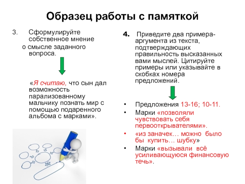 (доказательства, которые нужно привести в подтверждение высказанной мысли (номера предложений или цитаты из исходного текста).