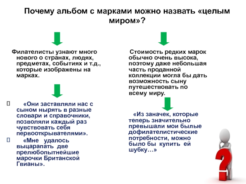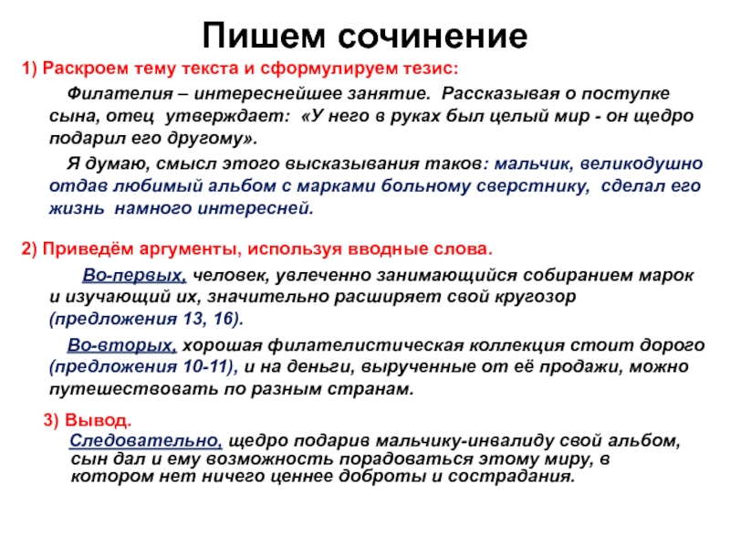 Во-первых, человек, увлеченно занимающийся собиранием марок и изучающий их, значительно расширяет свой кругозор (предложения 13, 16).