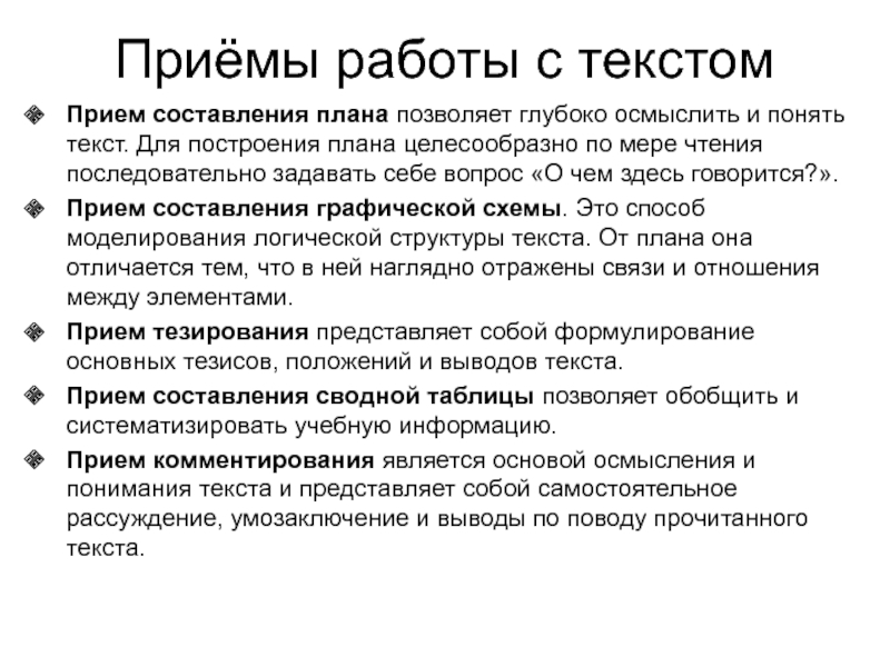 2. Анализ: выделение главной мысли, составление плана, тезисов, вопросов, схем, таблиц, написание выводов, поиск причинно-следственных связей, компрессия (сжатие текста), подбор примеров.