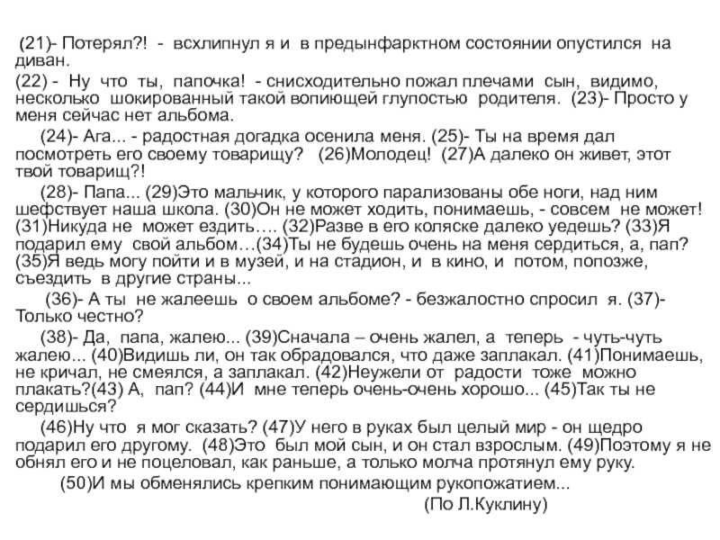 «Следовательно, великодушно подарив мальчику-инвалиду свой альбом, сын дал и ему возможность порадоваться этому миру, в котором нет ничего ценнее доброты и сострадания».