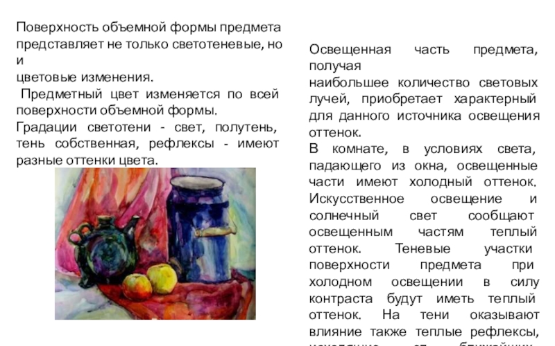 В комнате, в условиях света, падающего из окна, освещенные части имеют холодный оттенок. Искусственное освещение и солнечный свет сообщают освещенным частям теплый оттенок. Теневые участки поверхности предмета при холодном освещении в силу контраста будут иметь теплый оттенок. На тени оказывают влияние также теплые рефлексы, исходящие от ближайших предметов.