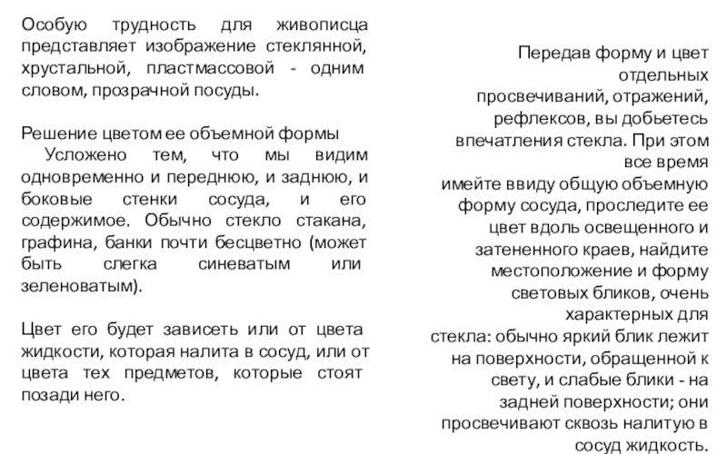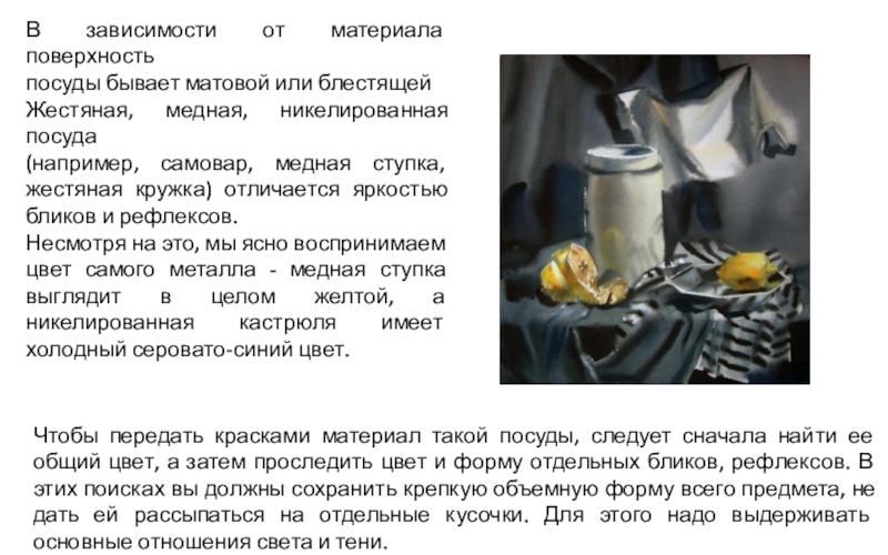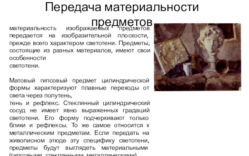 тень и рефлекс. Стеклянный цилиндрический сосуд не имеет явно выраженных градаций светотени. Его форму подчеркивают только блики и рефлексы. То же самое относится к металлическим предметам. Если передать на живописном этюде эту специфику светотени, предметы будут выглядеть материальными (гипсовыми, стеклянными, металлическими).