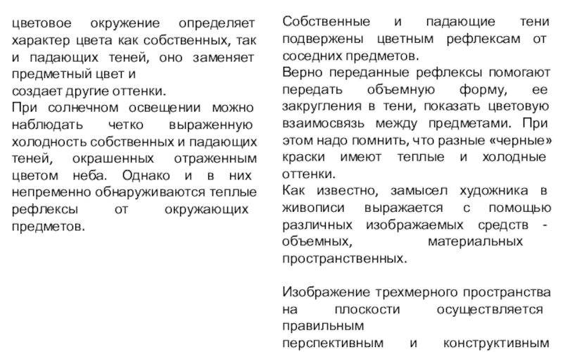 можно наблюдать четко выраженную холодность собственных и падающих теней, окрашенных отраженным цветом неба. Однако и в них непременно обнаруживаются теплые рефлексы от окружающих предметов.