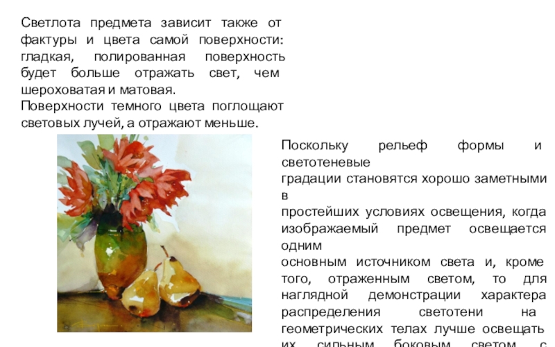Слайд 10Светлота предмета зависит также от фактуры и цвета самой поверхности: