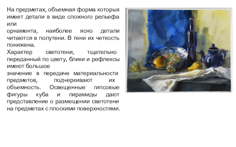 Слайд 12Поверхность объемной формы предмета представляет не только светотеневые, но и