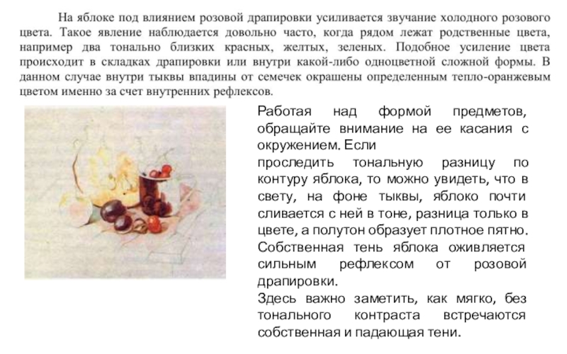 плоскости. Затем форма яблока, закругляясь, уходит вверх, и на нее уже не действует холодный отраженный свет драпировки. Если сравним эту часть яблока с выпуклой, ближайшей к нам, то заметим, что она не так активно, как полутон, положенный у блика, хотя лежат обе в области полутона.