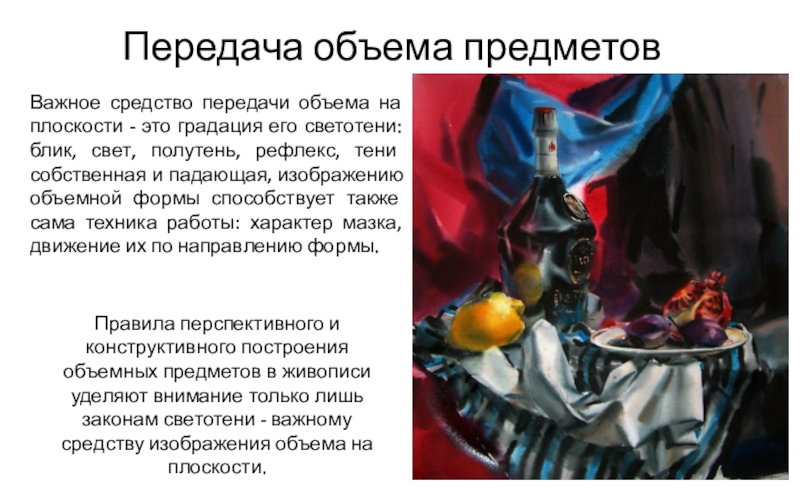Правила перспективного и конструктивного построения объемных предметов в живописи уделяют внимание только лишь законам светотени - важному средству изображения объема на плоскости.