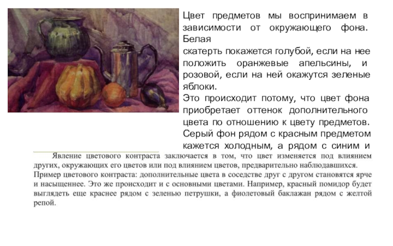 Слайд 42Цвет предметов мы воспринимаем в зависимости от окружающего фона. Белая
