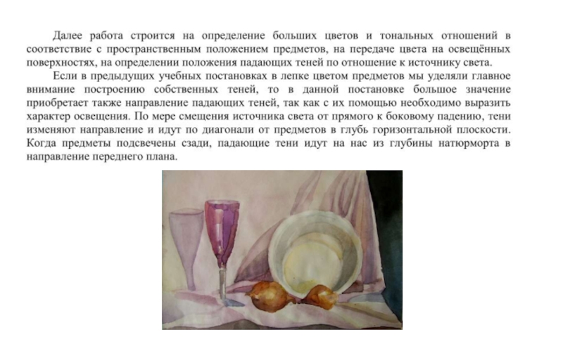 значение в передаче материальности предметов, подчеркивают их объемность. Освещенные гипсовые фигуры куба и пирамиды дают представление о размещении светотени на предметах с плоскими поверхностями.