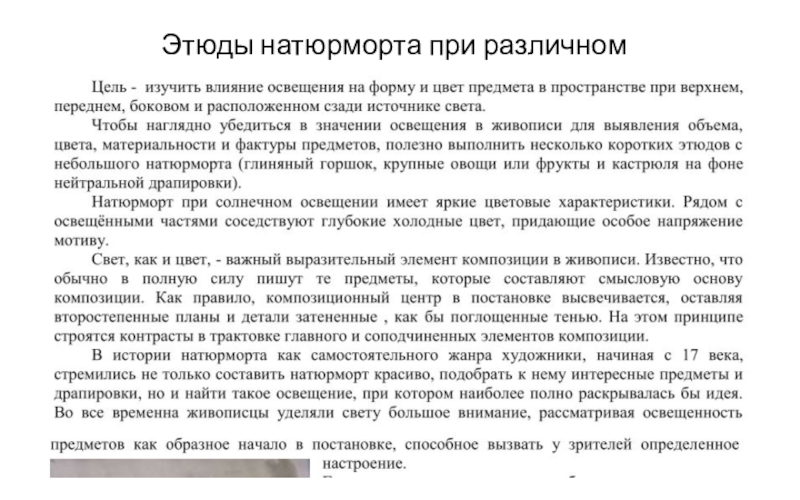 Слайд 36Этюды натюрморта при различном освещении