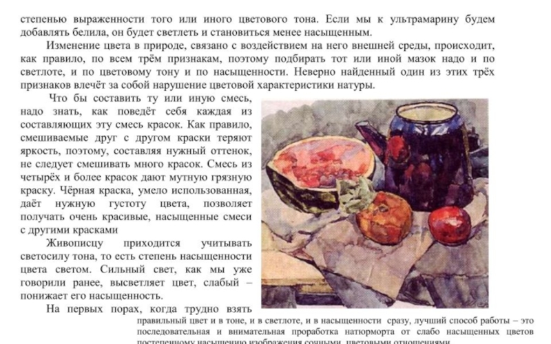 Отсюда можно сделать основополагающий для методики работы над живописью вывод: чтобы верно и живо взять какой-либо цвет, надо написать его окружение.