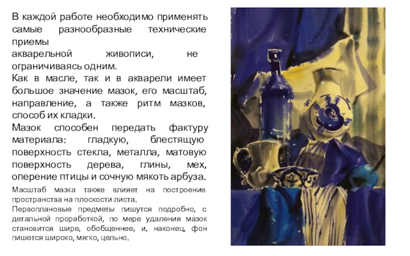 Мазок способен передать фактуру материала: гладкую, блестящую поверхность стекла, металла, матовую поверхность дерева, глины, мех, оперение птицы и сочную мякоть арбуза.