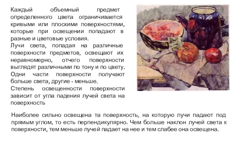 света, попадая на различные поверхности предметов, освещают их неравномерно, отчего поверхности выглядят различными по тону и по цвету. Одни части поверхности получают больше света, другие - меньше.
