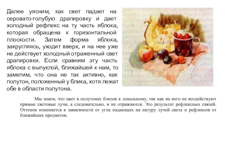 Слайд 28Далее уясним, как свет падает на серовато-голубую драпировку и дает
