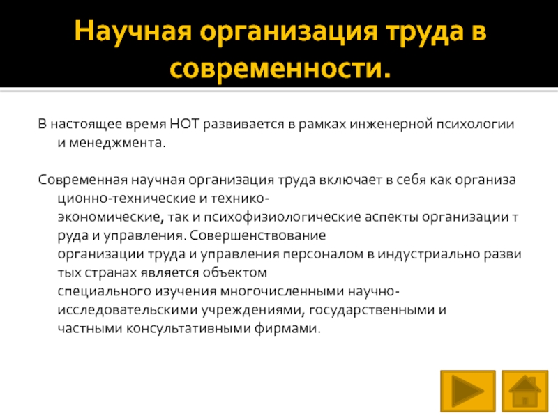 В настоящее время НОТ развивается в рамках инженерной психологии и менеджмента.