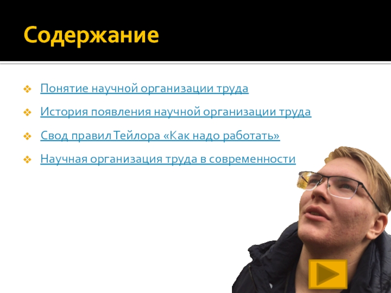 СодержаниеПонятие научной организации трудаИстория появления научной организации трудаСвод правил Тейлора «Как надо работать»Научная организация труда в современности