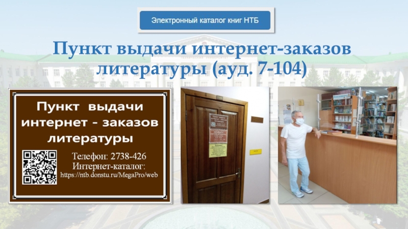Слайд 7Пункт выдачи интернет-заказов литературы (ауд. 7-104)