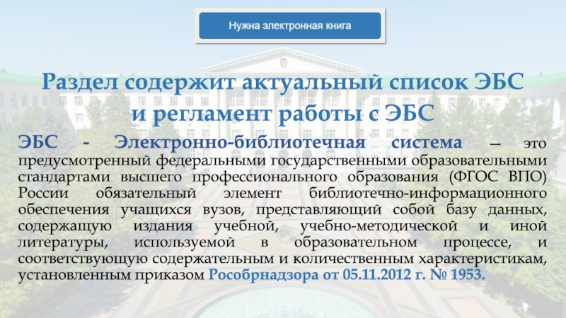 высшего профессионального образования (ФГОС ВПО) России обязательный элемент библиотечно-информационного обеспечения учащихся вузов, представляющий собой базу данных, содержащую издания учебной, учебно-методической и иной литературы, используемой в образовательном процессе, и соответствующую содержательным и количественным характеристикам, установленным приказом Рособрнадзора от 05.11.2012 г. № 1953.