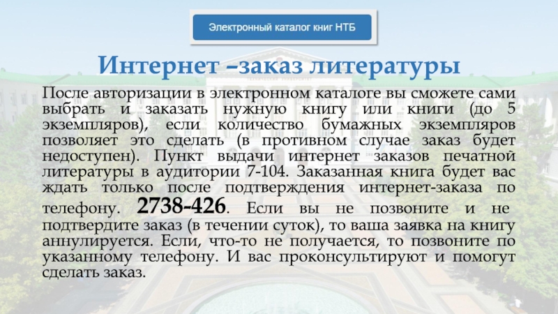 если количество бумажных экземпляров позволяет это сделать (в противном случае заказ будет недоступен). Пункт выдачи интернет заказов печатной литературы в аудитории 7-104. Заказанная книга будет вас ждать только после подтверждения интернет-заказа по телефону. 2738-426. Если вы не позвоните и не подтвердите заказ (в течении суток), то ваша заявка на книгу аннулируется. Если, что-то не получается, то позвоните по указанному телефону. И вас проконсультируют и помогут сделать заказ.