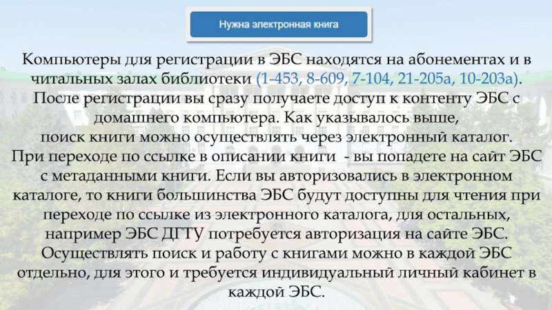 Слайд 12Компьютеры для регистрации в ЭБС находятся на абонементах и в