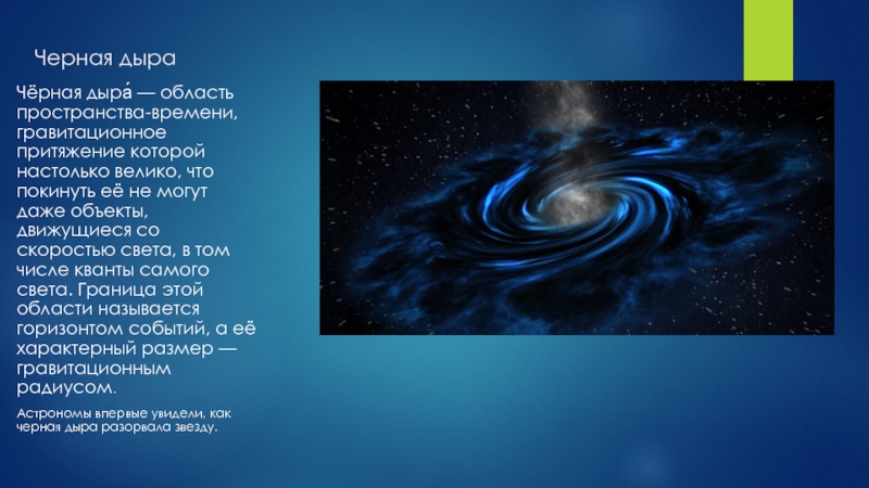 Чёрная дыра́ — область пространства-времени, гравитационное притяжение которой настолько