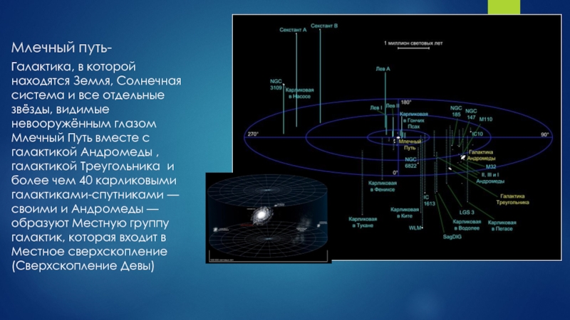 галактикой Андромеды , галактикой Треугольника и более чем 40 карликовыми галактиками-спутниками — своими и Андромеды — образуют Местную группу галактик, которая входит в Местное сверхскопление (Сверхскопление Девы)