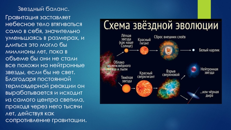пока в объеме бы они не стали все похожи на нейтронные звезды, если бы не свет. Благодаря постоянной термоядерной реакции он вырабатывается и исходит из самого центра светила, проходя через него тысячи лет, действуя как сопротивление гравитации.
