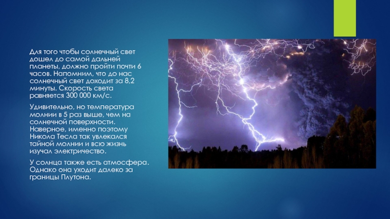 Удивительно, но температура молнии в 5 раз выше, чем на солнечной поверхности. Наверное, именно поэтому Никола Тесла так увлекался тайной молнии и всю жизнь изучал электричество.