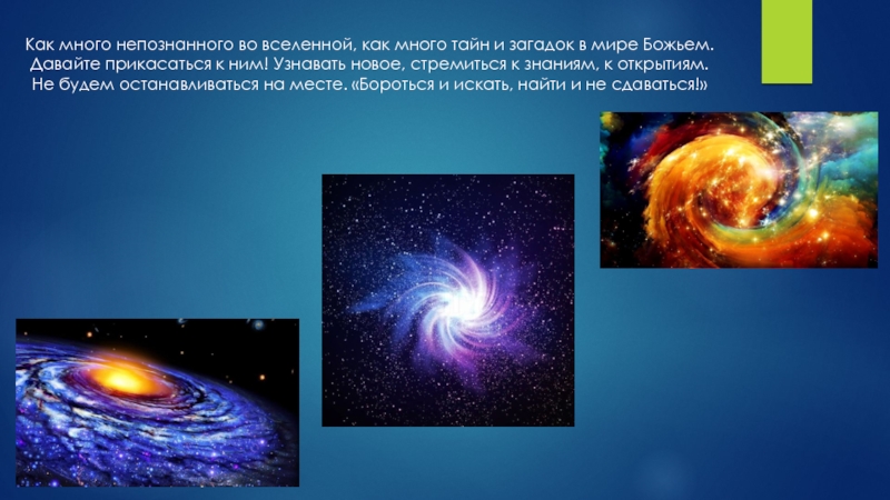 к знаниям, к открытиям. Не будем останавливаться на месте. «Бороться и искать, найти и не сдаваться!»