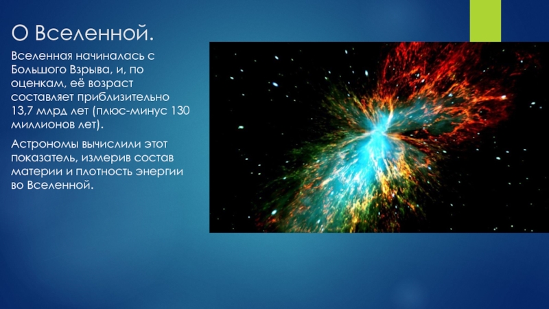 возраст составляет приблизительно 13,7 млрд лет (плюс-минус 130 миллионов лет).
