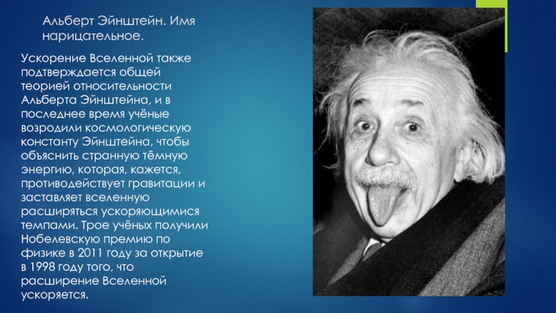Эйнштейна, чтобы объяснить странную тёмную энергию, которая, кажется, противодействует гравитации и заставляет вселенную расширяться ускоряющимися темпами. Трое учёных получили Нобелевскую премию по физике в 2011 году за открытие в 1998 году того, что расширение Вселенной ускоряется.