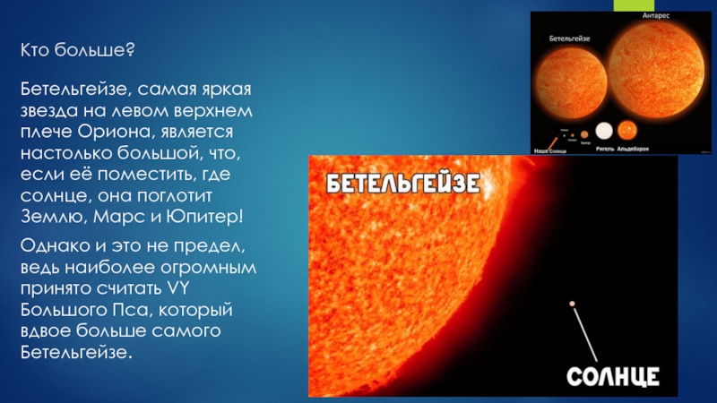 Однако и это не предел, ведь наиболее огромным принято считать VY Большого Пса, который вдвое больше самого Бетельгейзе.