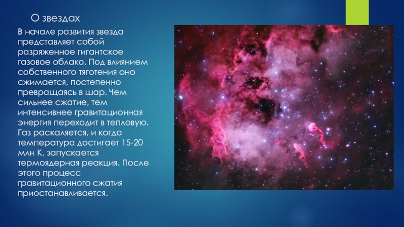 шар. Чем сильнее сжатие, тем интенсивнее гравитационная энергия переходит в тепловую. Газ раскаляется, и когда температура достигает 15-20 млн К, запускается термоядерная реакция. После этого процесс гравитационного сжатия приостанавливается.