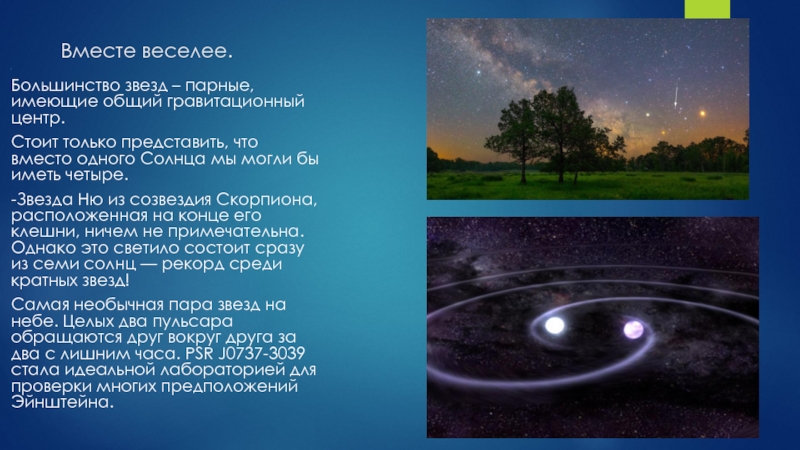 Самая необычная пара звезд на небе. Целых два пульсара обращаются друг вокруг друга за два с лишним часа. PSR J0737-3039 стала идеальной лабораторией для проверки многих предположений Эйнштейна.