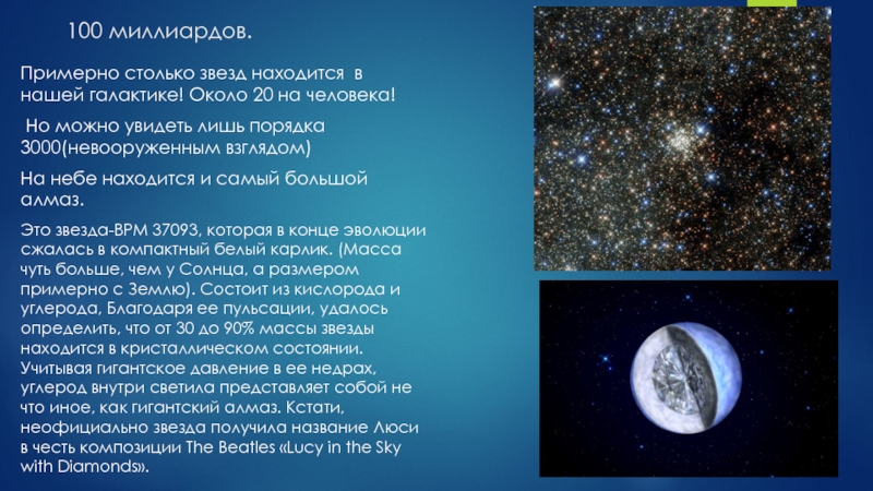 Это звезда-BPM 37093, которая в конце эволюции сжалась в компактный белый карлик. (Масса чуть больше, чем у Солнца, а размером примерно с Землю). Состоит из кислорода и углерода, Благодаря ее пульсации, удалось определить, что от 30 до 90% массы звезды находится в кристаллическом состоянии. Учитывая гигантское давление в ее недрах, углерод внутри светила представляет собой не что иное, как гигантский алмаз. Кстати, неофициально звезда получила название Люси в честь композиции The Beatles «Lucy in the Sky with Diamonds».