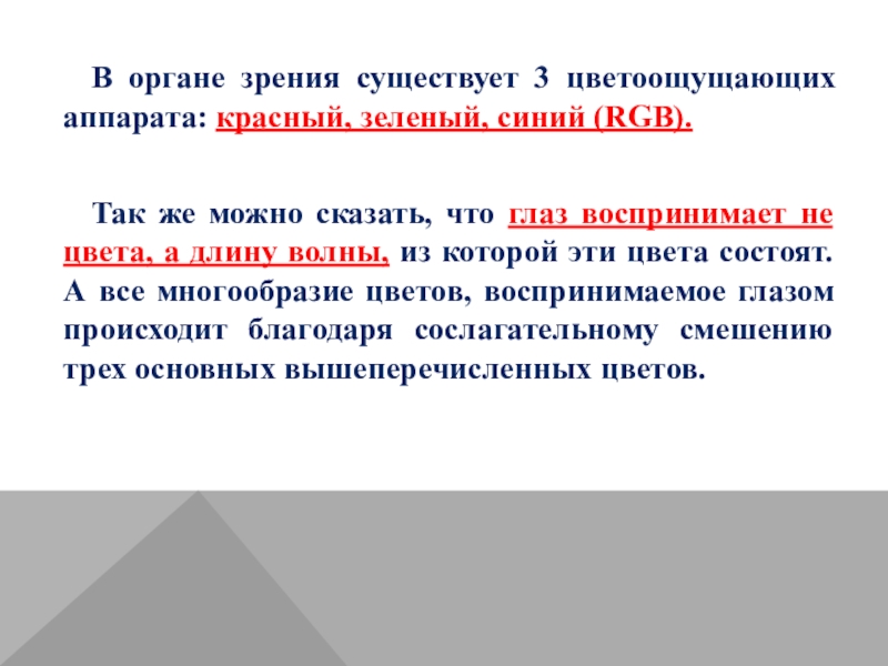Слайд 19В органе зрения существует 3 цветоощущающих аппарата: красный, зеленый, синий