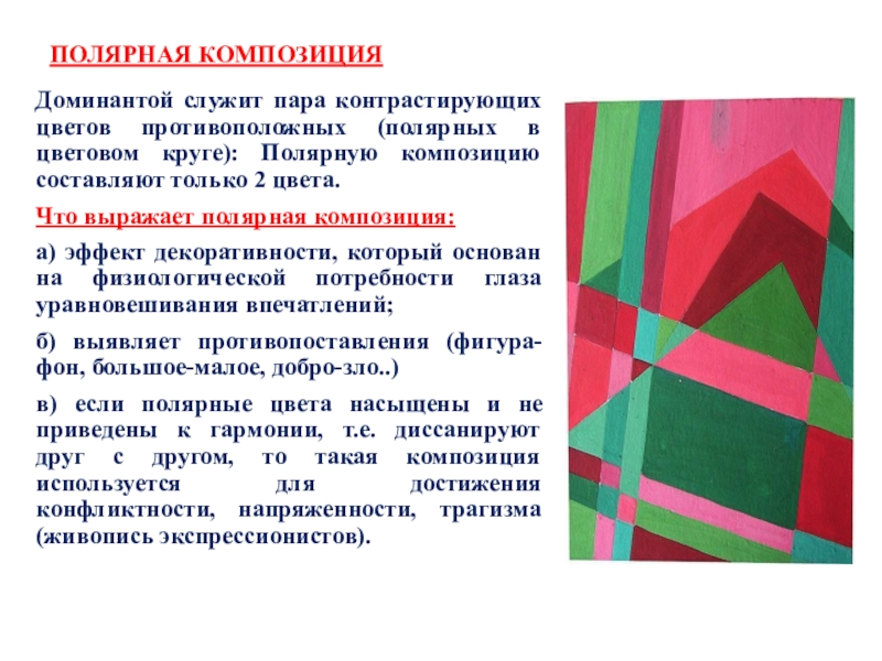 в) если полярные цвета насыщены и не приведены к гармонии, т.е. диссанируют друг с другом, то такая композиция используется для достижения конфликтности, напряженности, трагизма (живопись экспрессионистов).